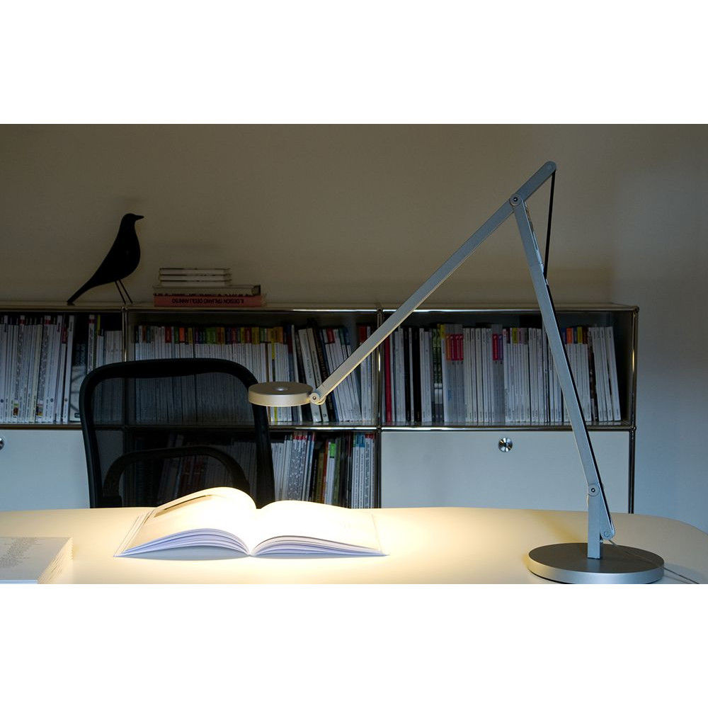 Lampada di design con caratteristiche molto versatili e moderne. La sua struttura in alluminio e la base con zavorra in ghisa garantiscono stabilità e robustezza, mentre il cavo elastico bilanciato permette movimenti fluidi.